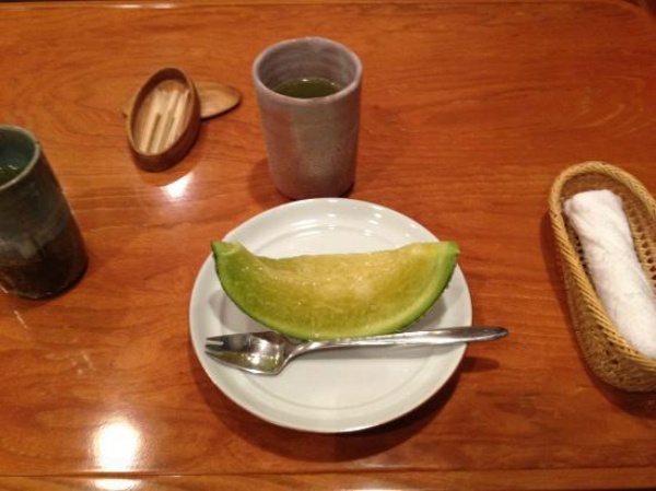 Cuối cùng, để kết thúc bữa ăn, Jiro đem tới cho khách hàng của mình một miếng dưa lưới mát lạnh với vị ngọt man mát rất có lợi cho hệ tiêu hóa. Những trái cây này cũng được Yoshikazu, con trai cả của Jiro tuyển chọn kỹ càng nên luôn đảm bảo một vị ngọt như mật ong cho món tráng miệng.