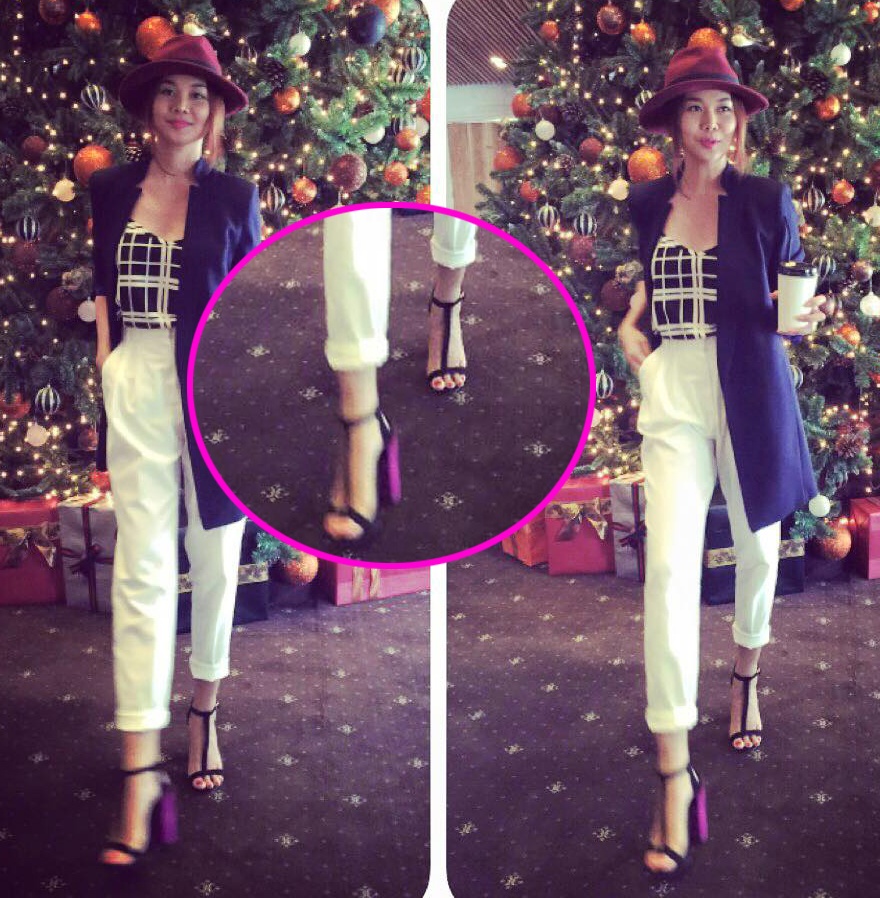 Giày cao gót ánh kim: Xu hướng giày ánh kim nở rộ vào mùa xuân 2015. Đón đầu phong cách này, Thanh Hằng chọn kiểu dáng nhiều dây sang trọng. Vẫn với phong cách nam tính thường thấy, cô mix phụ kiện ăn ý cùng set đồ đời thường cá tính.