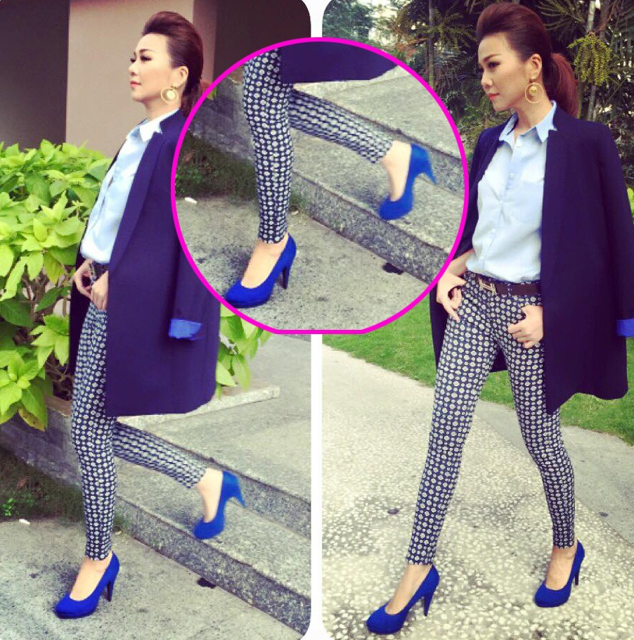 Giày khoét lòng, mũi nhọn: Xu hướng giày khoét lòng tạo sự thoải mái, thông thoáng cho người sử dụng mà không mất đi vẻ nữ tính, tinh tế. Kiểu dáng mũi nhọn mang lại nét cổ điển, sang trọng, phù hợp với những bộ cánh thanh lịch. Thanh Hằng chọn cách mix đậm chất cổ điển khi ứng dụng xu hướng này.