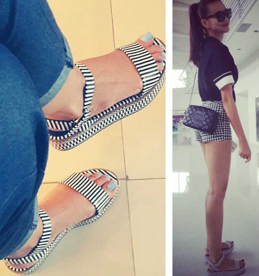 | Sandals sọc kẻ bắt nhịp xu hướng được nữ diễn viên Siêu nhân X ứng dụng ăn nhập cùng trang phục mùa hè phóng khoáng. |