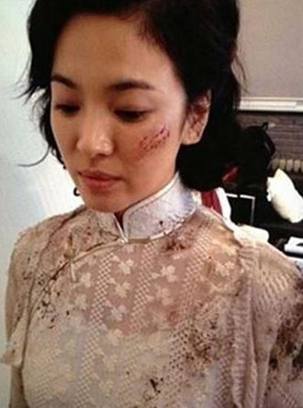 | Mới đây, bức ảnh mỹ nhân xứ Hàn Song Hye Kyo bị xước mặt, bộ sườn xám trên người bị rách, vấy bẩn trên trường quay phim Con tàu Thái Bình không khỏi khiến người hâm mộ tò mò. Con tàu Thái Bình là bộ phim Trung Quốc mới nhất mà kiều nữ xứ Hàn tham gia do đạo diễn Ngô Vũ Sâm chỉ đạo. |