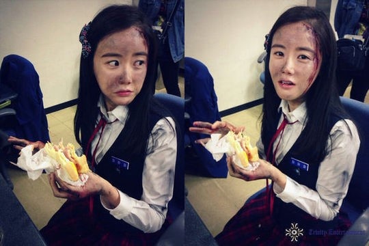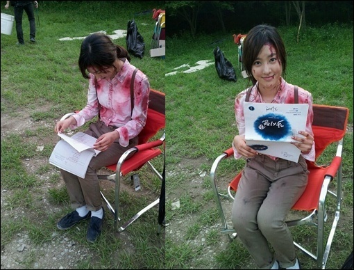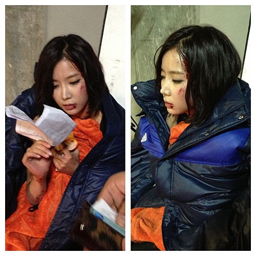 | Nữ diễn viên Im Soo Hyang trong tình trạng xây xước mặt, đầu bết tóc đang đọc lại kịch bản bộ phim IRIS 2 – nơi cô vào vai một nữ sát thủ có nhiều cảnh chiến đấu gay cấn, dẫn tới cả đổ máu. |