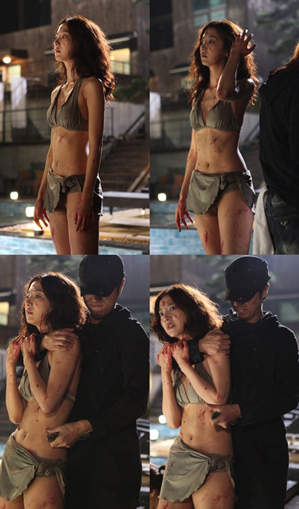 | Song Min Jung diện bikini gợi cảm nhưng trên người đầy vết máu và vết xước , đang bị một người đàn ông mặc đồ đen đe dọa trong phim truyền hình Vampire Prosecutor. |