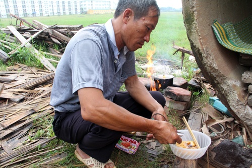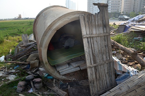 Nơi ở của chú được che chắn tạm bợ, không có đồ đạc gì giá trị ngoài vài bộ quần áo. Chiếc bếp cạnh đó cũng chỉ được dựng tạm bằng mấy viên gạch và đun bằng củi nhặt xung quanh công trường đối diện.