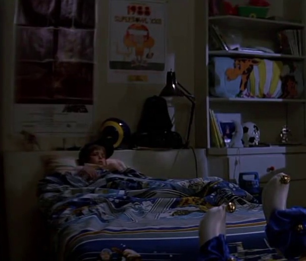 Cảnh quay hai đứa bé bị chú hề đồ chơi dọa cho chết khiếp đúng là đáng sợ, nhưng hãy chú ý đến tấm poster trên tường có dòng chữ “1988 Super Bowl XXII”. Chuyện trẻ con dán poster trận Super Bowl trong phòng rất đỗi bình thường, nhưng mấu chốt là Poltergeist được phát hành từ năm 1982, tức trước sự kiện trên hình tận 6 năm.