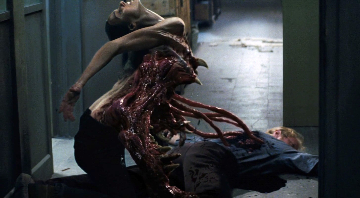 Slither (2006): Một thiên thạch chứa đựng loài ký sinh trùng gớm ghiếc rơi xuống thị trấn Wheelsy yên bình. Sau một thời gian chờ đợi, chúng chọn thân xác chàng trai Grant Grant giàu có nhất vùng làm “nơi trú ngụ”. Kể từ đó, Grant thèm khát thịt tươi, từ thịt đông lạnh, thú cưng, gia cầm và cuối cùng là thịt người. Loài ký sinh trùng đỏ tươi trông giống như lũ đỉa hút máu, dần dà biến đổi cơ thể vật chủ trở nên gớm ghiếc. Đây vốn là tác phẩm điện ảnh đầu tay của đạo diễn James Gunn, tác giả bom tấn Guardians of the Galaxy (2014) sau này. |