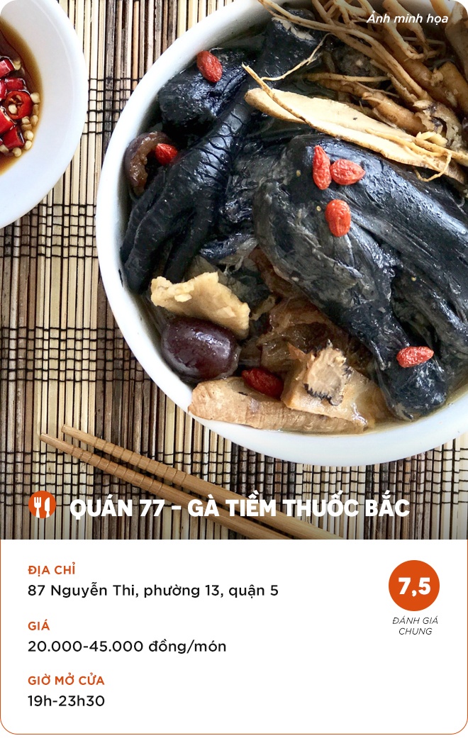 - Quán vỉa hè, thực đơn khoảng 7 món, nổi tiếng nhất là gà ác tiềm thuốc bắc