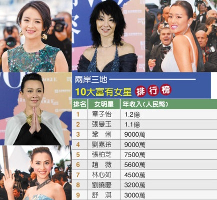 | 1. Chương Tử Di: Sau thành công của bộ phim Ngọa Hổ Tàng Long, tên tuổi của Chương Tử Di đã vươn tầm thế giới. Nắm bắt cơ hội này, người đẹp tích cực góp mặt trong các bộ phim tầm cỡ, tham dự các sự kiện trong nước và quốc tế, làm giám khảo cho các chương trình truyền hình thực tế … Với tiếng tăm của một ngôi sao quốc tế và mức độ phủ sóng rộng rãi, Chương Tử Di đã thu về 120 triệu nhân dân tệ (hơn 417 tỷ đồng) từ đầu năm đến nay. |