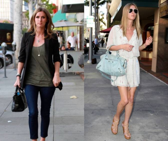 Nicky Hilton có rất nhiều phong cách đời thường thay đổi từ sành điệu cho tới nữ tính. Cô em gái nhà Hilton thường diện áo trắng với quần short jeans vào mùa hè. Cô cũng không ngại thử nghiệm những item lạ với nhau như cardigan kiểu dáng kimono kết hợp cùng skinny jeans. Trang phục dạo phố của cô thường là legging đen, blazer và túi da to bản. |