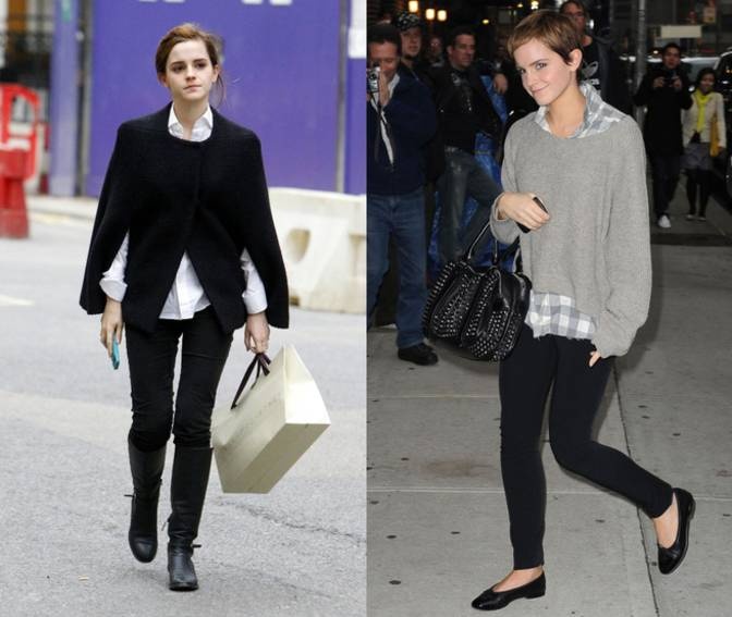 Phong cách thời trang của ngôi sao Harry Porter - Emma Watson khá gai góc khi không ngại kết hợp áo khoác dài với boots thấp cổ ton sur ton cùng tất đen. Đen và trắng cũng là hai màu chủ đạo trong rất nhiều bộ trang phục của nữ diễn viên trẻ. Cũng giống như nhiều fashion icon khác, Emma luôn ưu ái phụ kiện túi to bản bởi tính tiện dụng và hợp thời trang. |