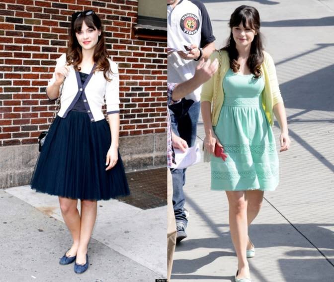 Diễn viên hài tài năng Zooey Deschanel gây ấn tượng với người hâm với bộ sưu tập váy đa dạng cả về kiểu dáng lẫn màu sắc của mình. Zooey thường phối tất đen với váy chữ A xòe để che khuyết điểm dáng vẻ nhỏ nhắn. Ngoài ra áo khoác mix cùng legging, quần tất hay jeans cũng là một lựa chọn của Zooey để thay đổi sang phong cách trẻ trung năng động. |