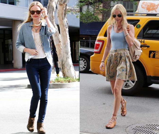 Nữ diễn viên xinh đẹp Kate Bosworth luôn nổi bật trong mọi bộ trang phục nhờ mái tóc vàng óng ả cùng làn da trắng sứ hoàn hảo. Các nhãn hiệu ưa thích của cô là Mulberry, Vanessa Bruno và Chloe Baylee. Phong cách thường thấy ở nữ diễn viên người Mỹ là quần skinny đen mix cùng áo trắng, túi da to bản và không thể thiếu cặp kính râm thời thượng. Kate cũng thường lựa chọn váy ngắn để khoe khéo đôi chân dài miên man. |
