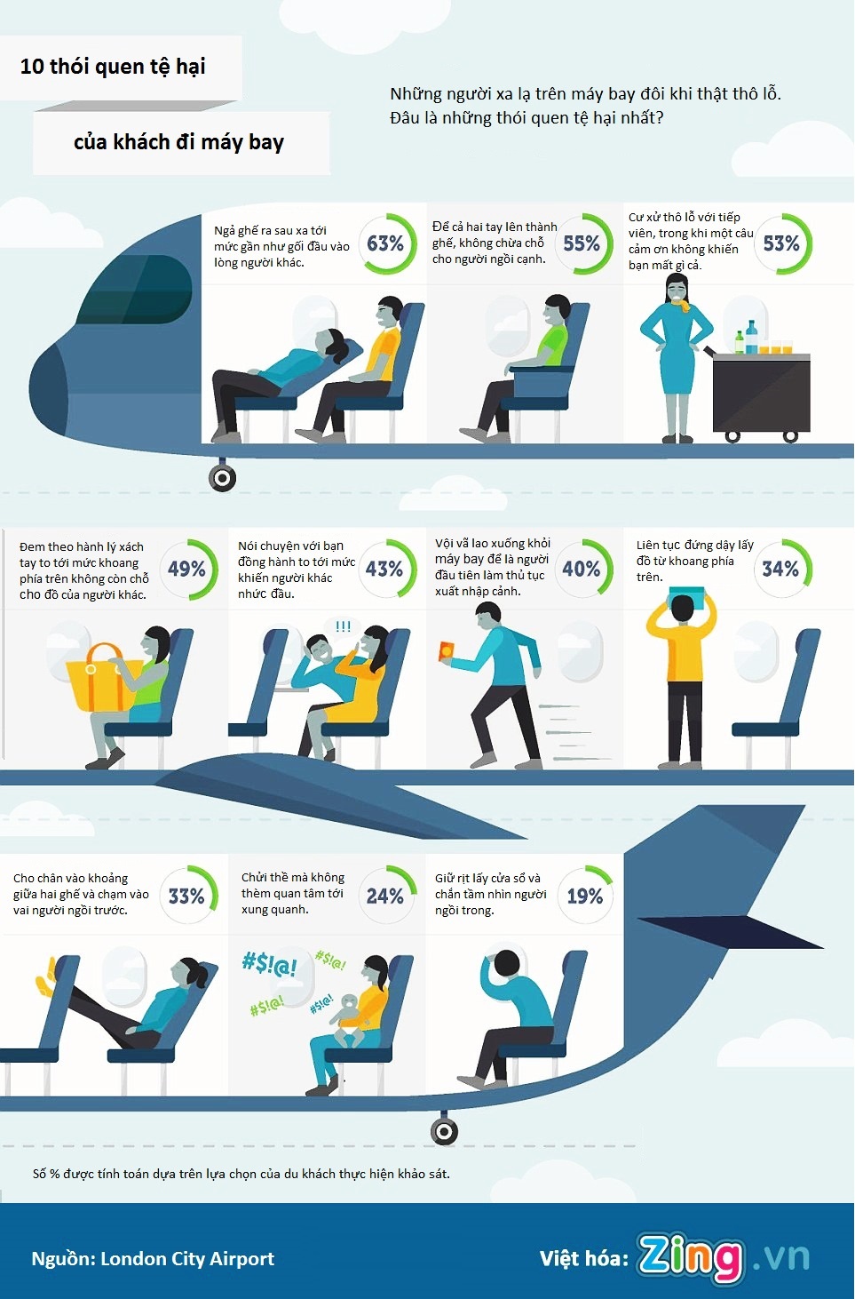 London City Airport thực hiện khảo sát các hành khách và đưa ra 10 hành động gây khó chịu nhất, trong đó có việc ngả ghế quá thấp và chiếm hết chỗ đặt tay.