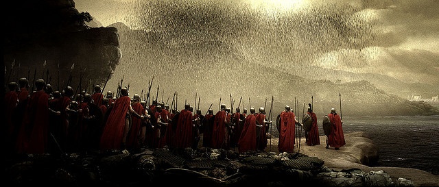 3.000 binh lính đối đấu với 300 chiến binh Sparta tại một hẻm núi nhỏ nhưng kỹ thuật tấn công - phòng ngự điêu luyện và tinh thần vững chãi đã khiến Xerxes hoảng sợ rút quân. Hiệu ứng slow-motion đặc trưng của đạo diễn Zack Snyder giúp cho từng cảnh chiến đấu của phim như một bức tranh chiến trận ngập trong biển máu.