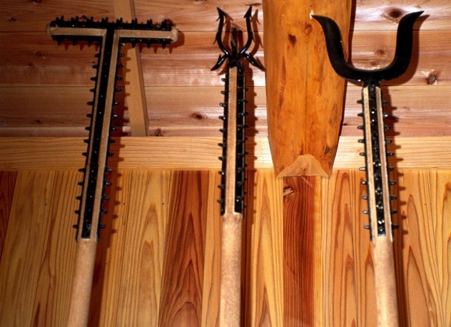 Sodegarami có nghĩa là “dây trói nô lệ” và là trang bị của cảnh vệ thời kỳ Edo. Sodegarami gồm các thanh gậy có gai, thường được dùng để làm rối kimono của mục tiêu. Các cảnh vệ sẽ luồn gậy vào áo kimono, nhanh tay quay vũ khí để cuốn lớp vải và hạ gục kẻ thù mà không gây quá nhiều sát thương. Thường một người sẽ tấn công từ phía trước và người còn lại phối hợp từ phía sau. Khi kimono bị cuốn vào hai thanh sodegarami cùng lúc, mục tiêu sẽ khó có thể trốn thoát. Đây là vũ khí quan trọng để bắt giữ các samurai vì theo luật, samurai chỉ có thể bị giết bởi một samurai khác. Khi một samurai phạm tội, cảnh vệ sẽ sử dụng sodagarami để hạ gục mục tiêu mà không phải đổ máu. |
