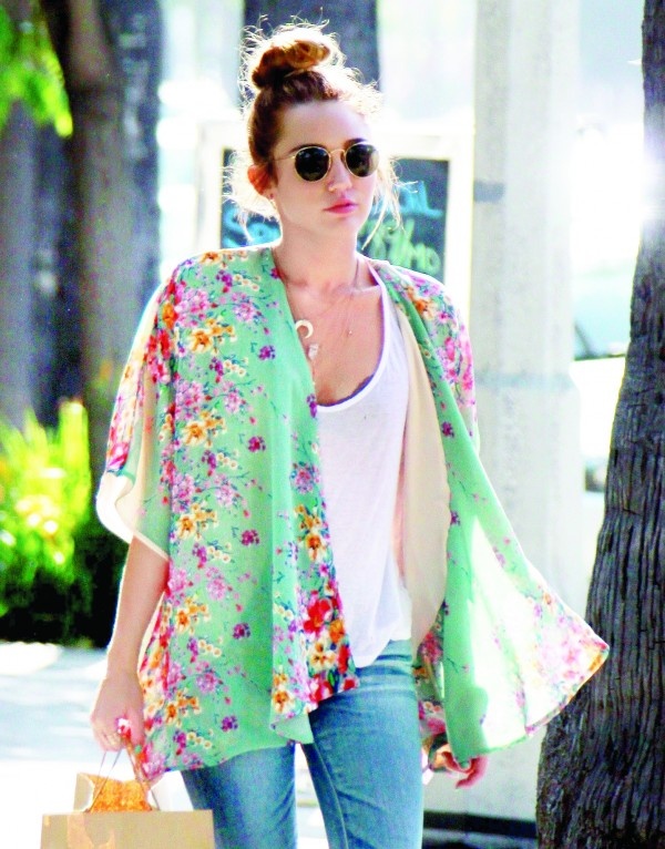 | Áo khoác kimono: Có thể thích hợp với mọi kiểu trang phục hàng ngày khác. Ca sĩ Miley Cyrus kết hợp trang phục đơn sắc cùng kimono hoạ tiết để bộ trang phục căn bản thêm cá tính. |