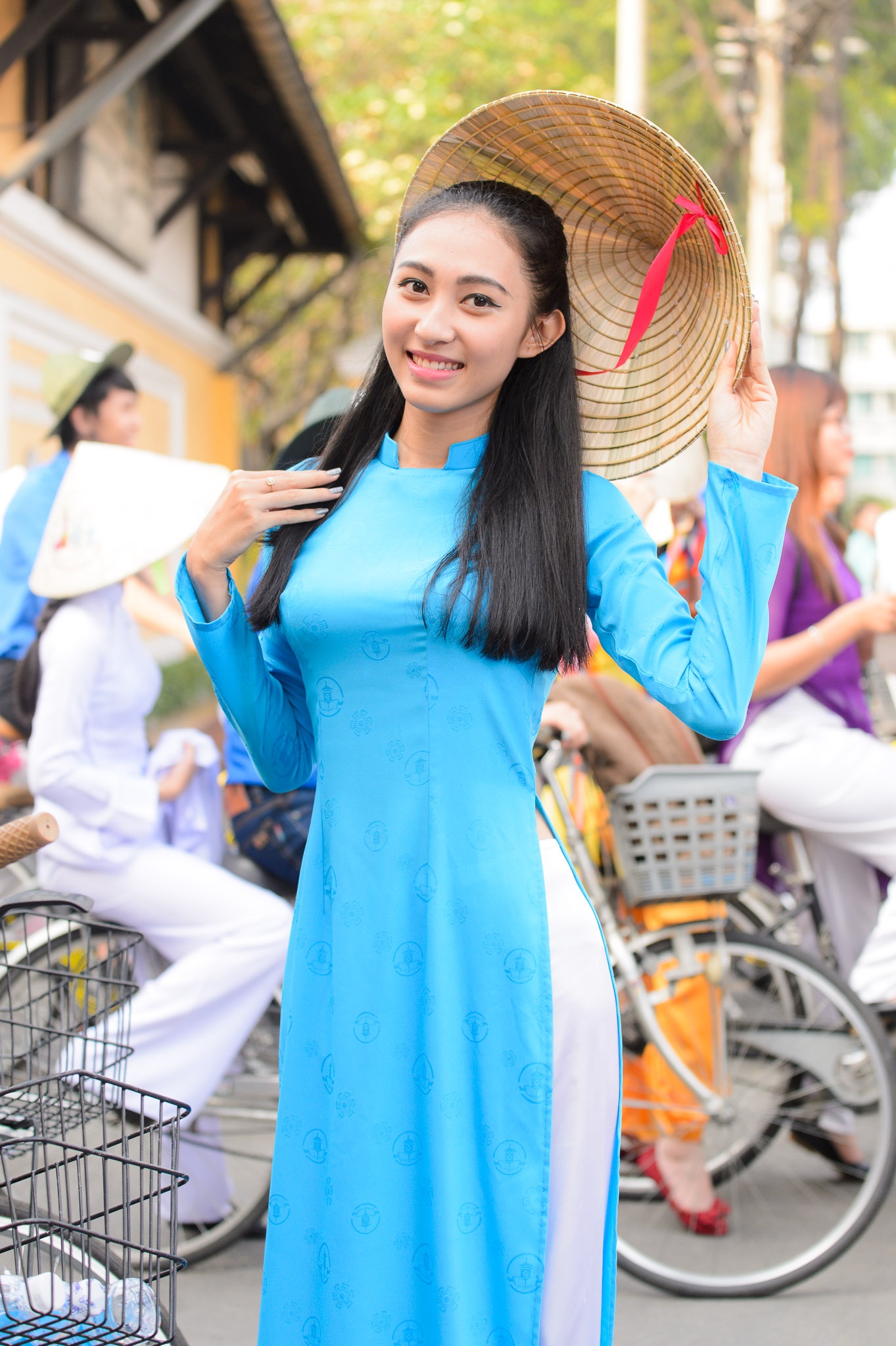 | Một nữ sinh điệu đà với tà áo màu xanh, quần trắng nền nã. Cô tạo dáng cùng nón lá khi được chụp ảnh. Nữ sinh cho biết, bản thân cảm thấy tự hào khi được tham gia sự kiện. Đây là một trong những hoạt động ý nghĩa khơi gợi tình yêu giá trị văn hóa ở người Việt. |