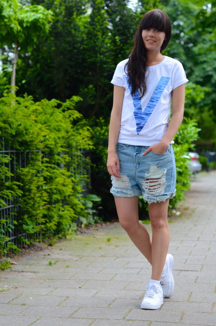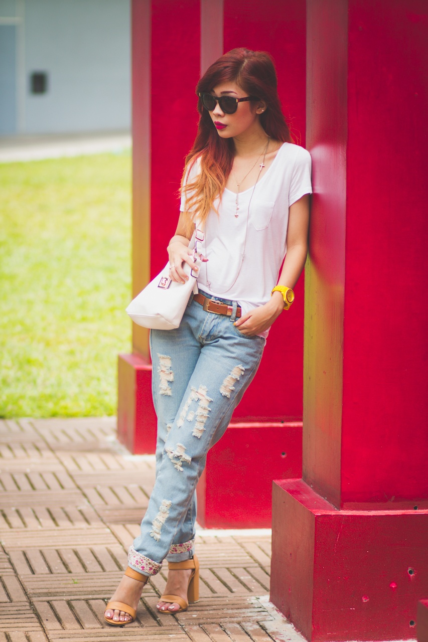 | Áo thun trắng đóng bộ cùng quần boyfriends rất hợp với ngày nắng. |