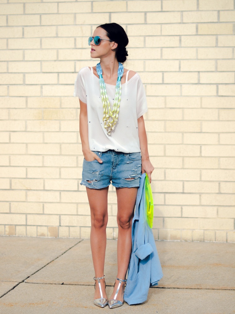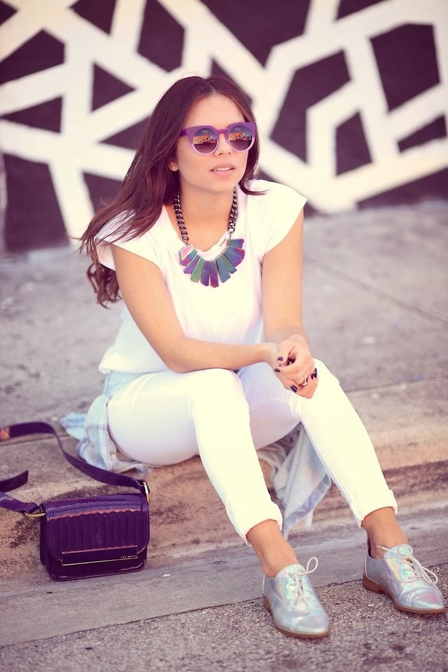 | Áo thun và quần shorts trở nên điệu đà hơn với đôi giày mũi nhọn ánh kim. |