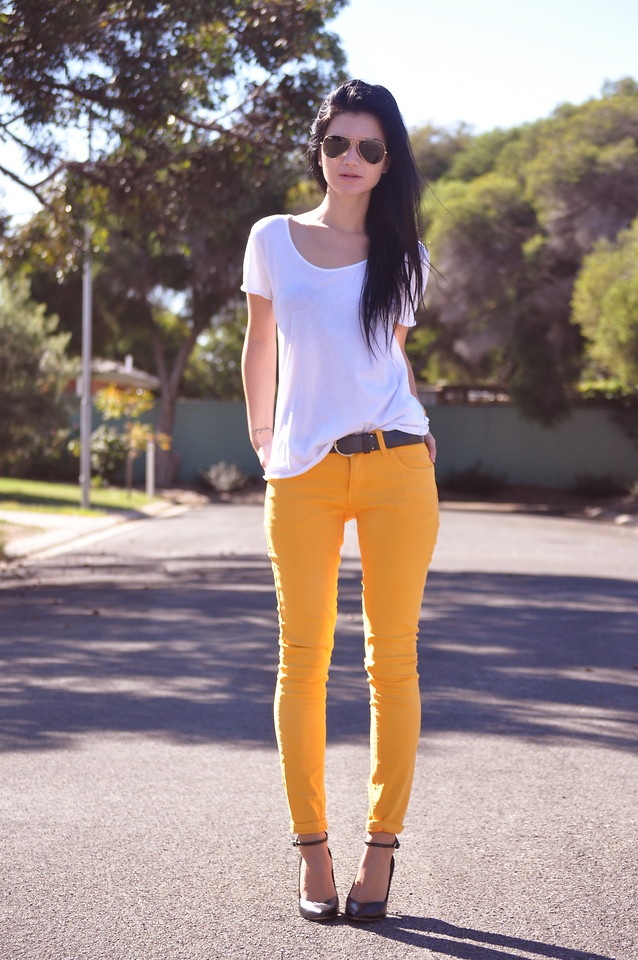 | Hay năng động, thoải mái với các mix áo thun, quần skinny rực rỡ màu nắng. |