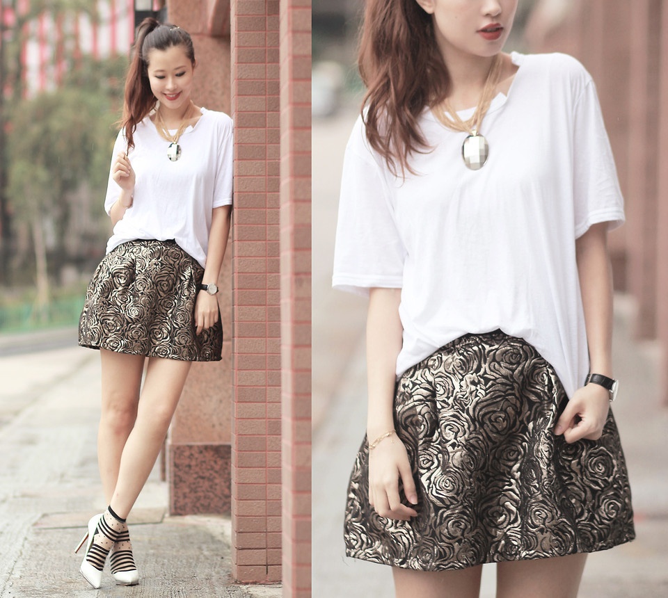 | Chiếc áo thun đơn giản trở nên điệu đà khi mix kèm chân váy xòe chất liệu ánh kim và phụ kiện cá tính. |