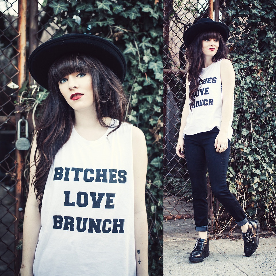 | Áo thun trắng in chữ thêm phần cá tính với cách kết hợp phụ kiện màu đen. |