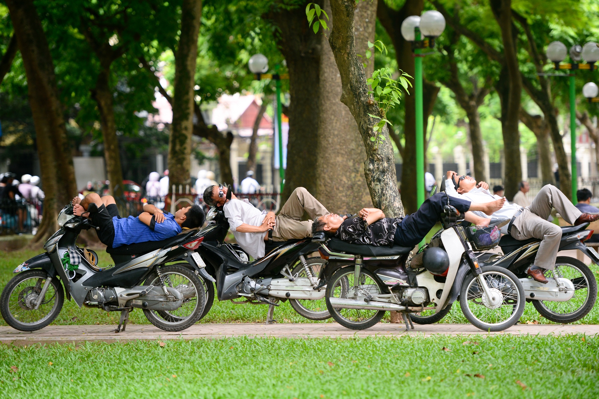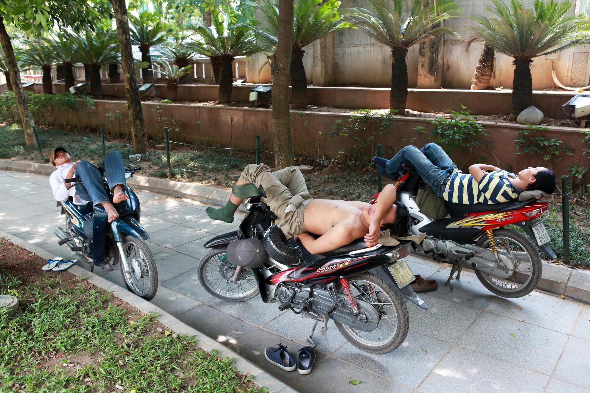 | Cánh xe ôm có thể nằm dọc trên xe máy đánh một giấc dài mà không sợ bị ngã. |