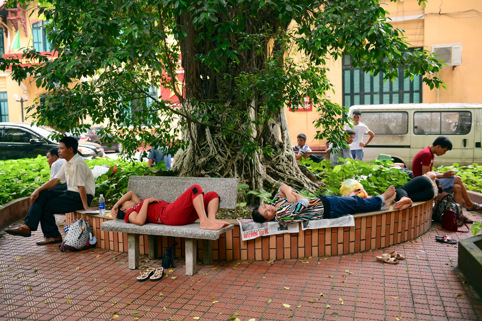 | Sân vườn trong bệnh viện Việt Đức tràn ngập cảnh người thân bệnh nhân ngủ vạ vật. |