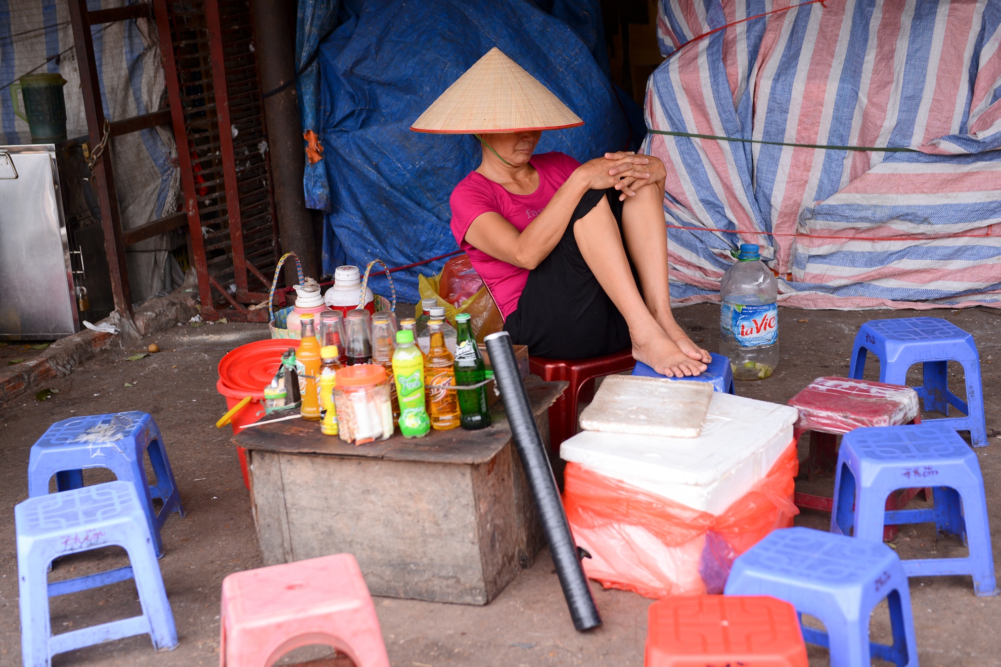 | Chợ đã vắng người không còn nhộn nhịp cảnh mua bán, chủ quán nước cũng tạm đánh giấc vài phút vào buổi trưa. |