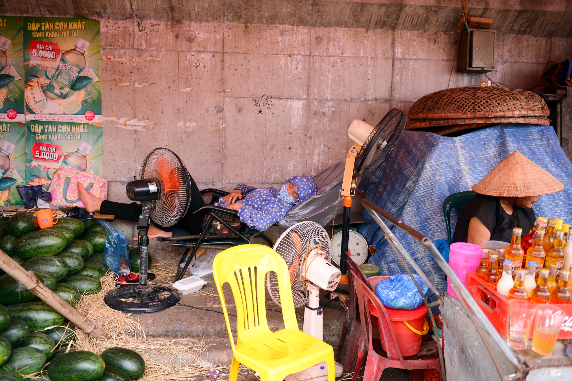 | Người phụ nữ buôn dưa hấu ngay dưới gầm cầu Long Biên ngon giấc bên quầy hàng. |