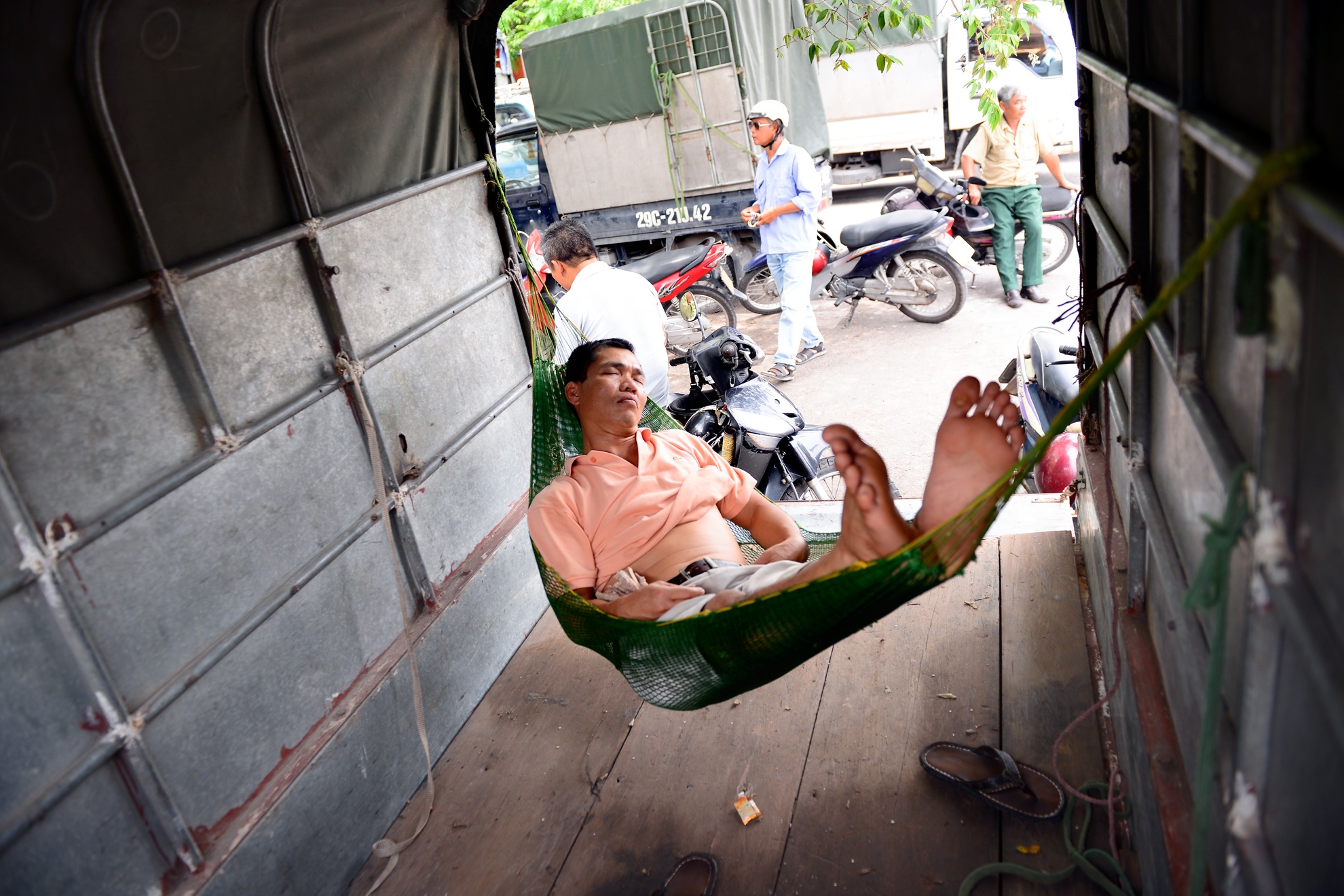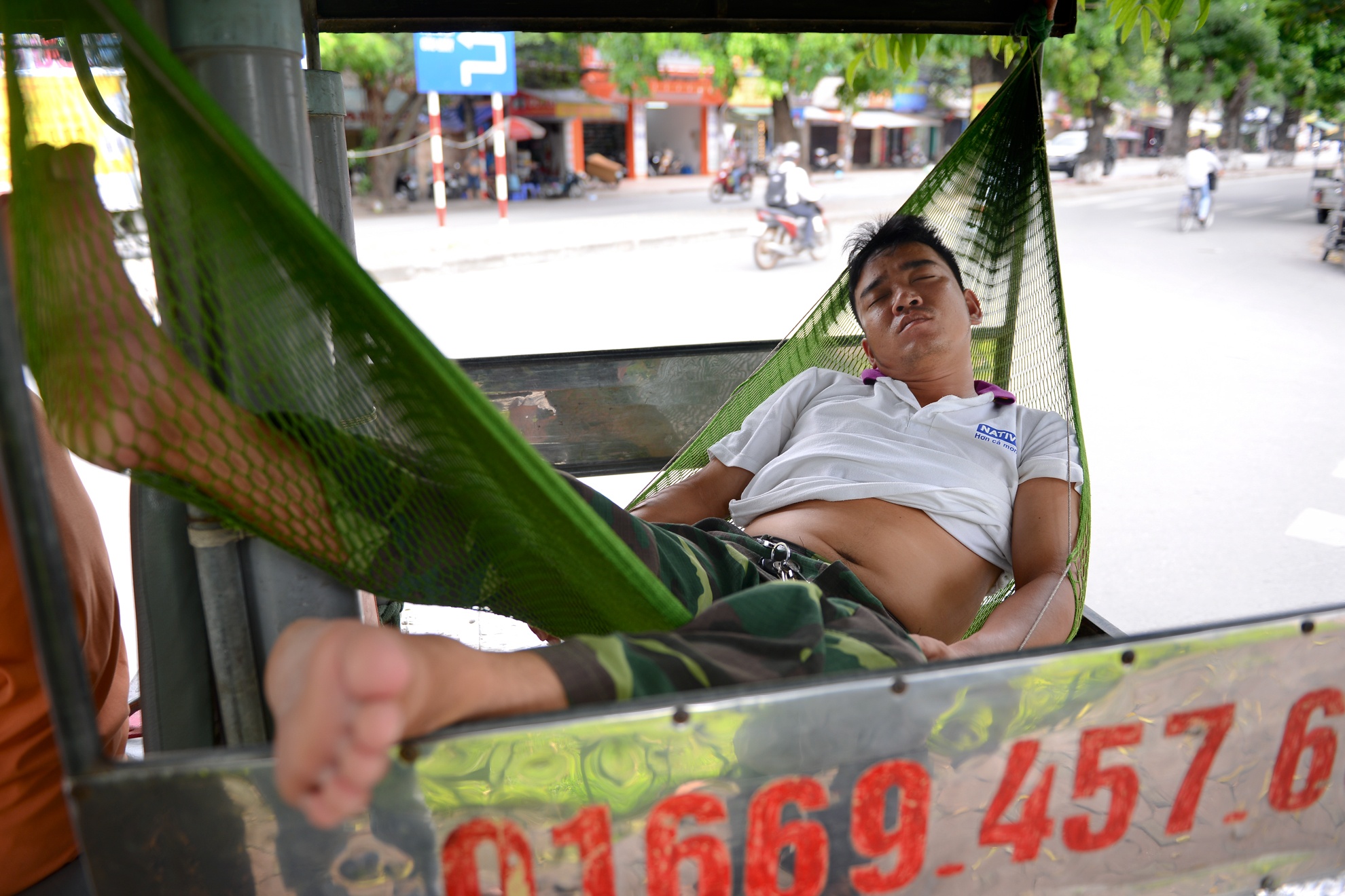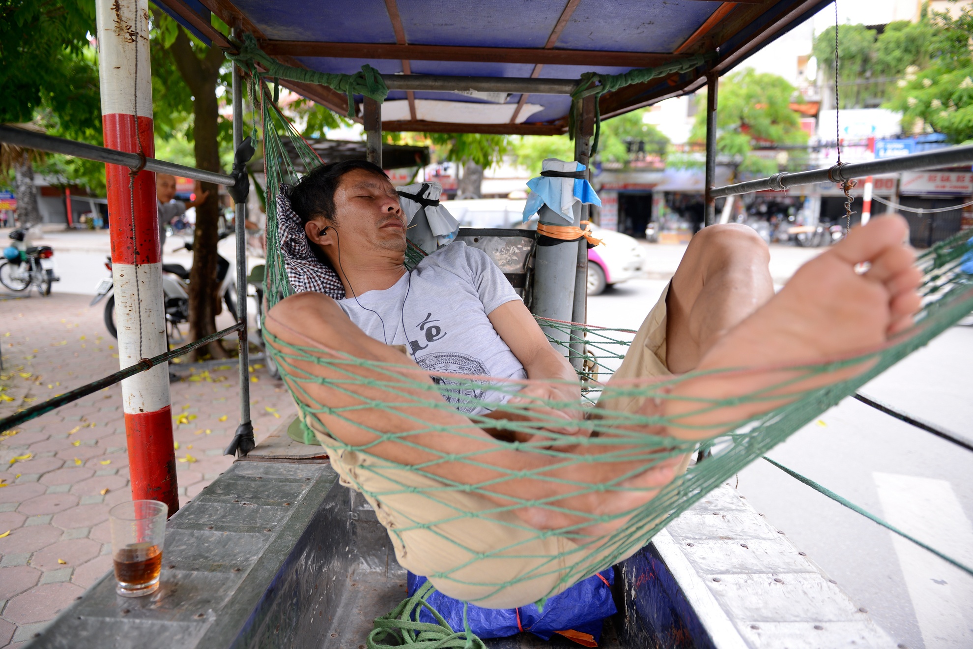 | Một người đàn ông lái xe ba bánh ngon giấc trưa hè trên chiếc võng mắc tạm đằng sau xe trên vỉa hè đường Láng. |
