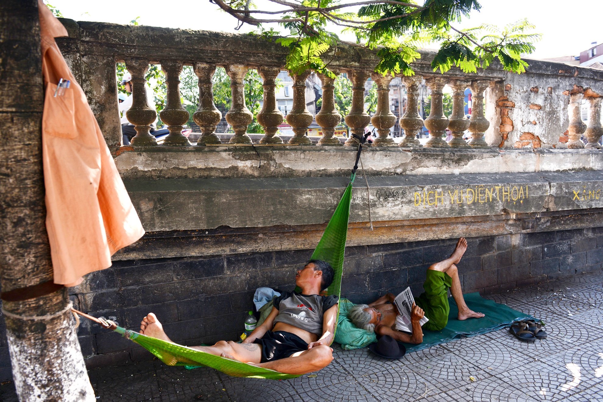 | Bóng mát ở gầm cầu Long Biên trở thành địa điểm lý tưởng cho người lao động xa, người vô gia cư mắc võng trải chiếu nằm nghỉ. |