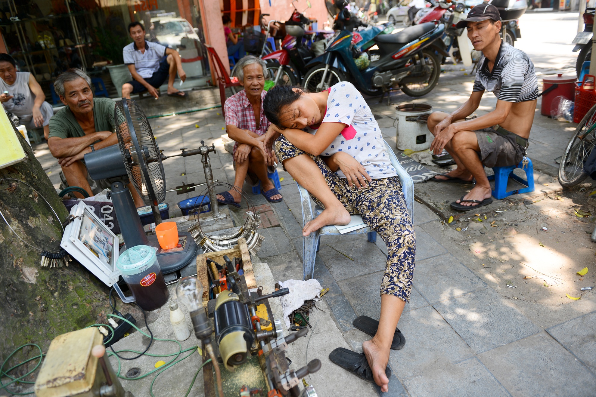 | Một nữ thợ sửa khoá trên vỉa hè phố Phủ Doãn vô tư ngủ trưa. |