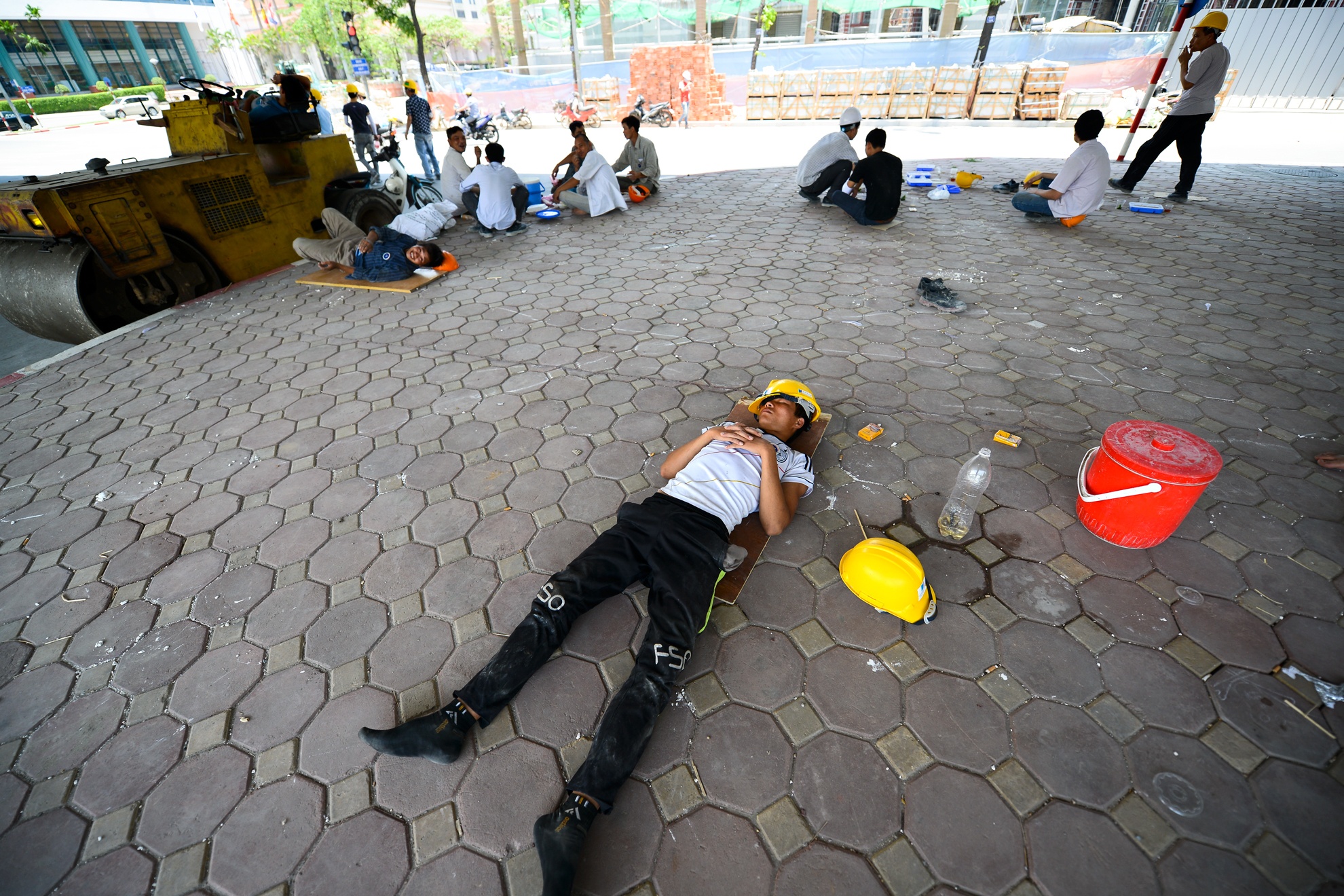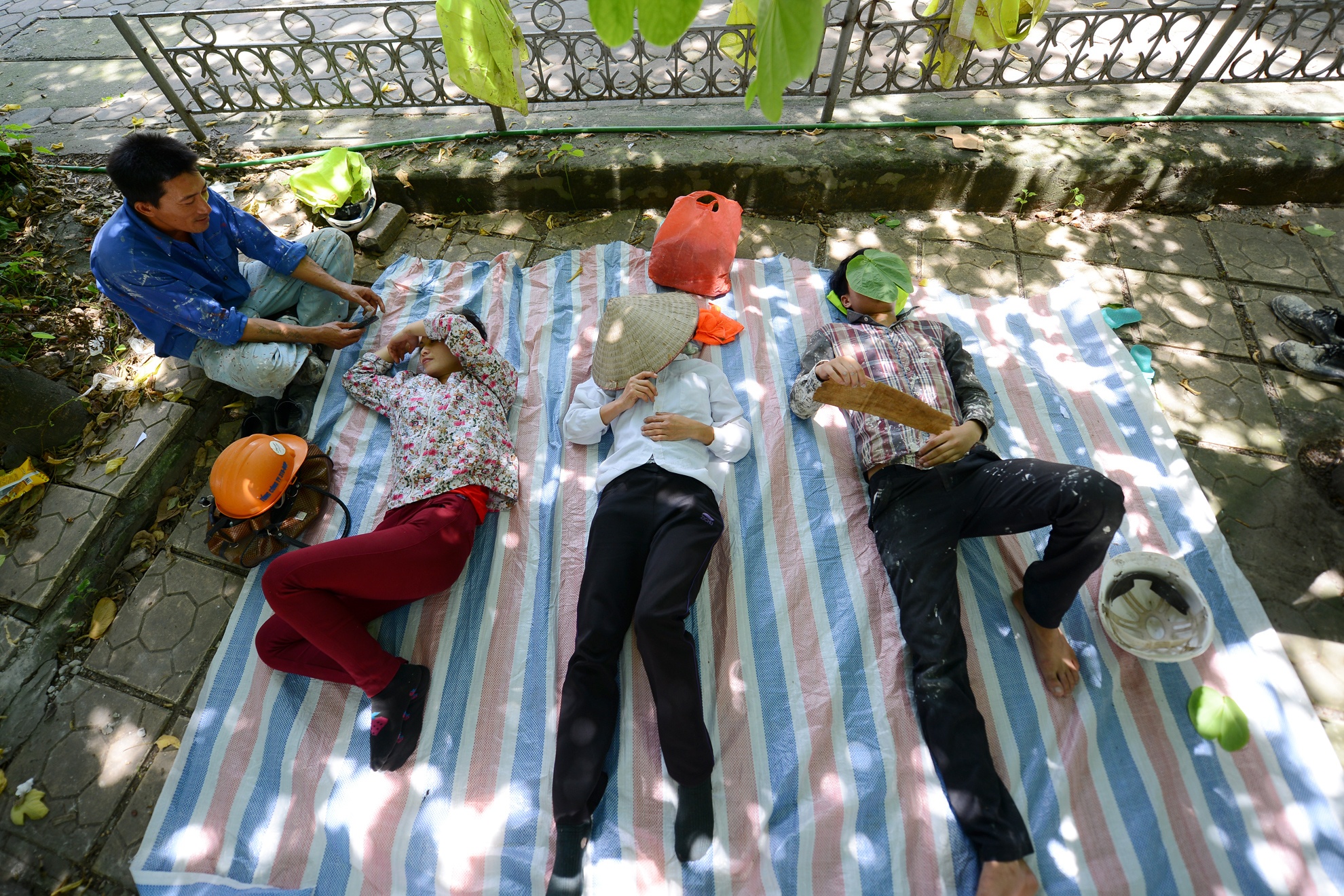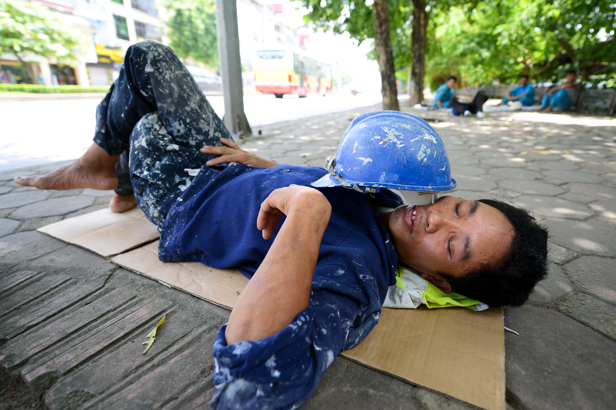 | Những anh thợ nề, thợ xây dựng trải tạm tấm bìa carton để ngả lưng ít phút trước khi bước vào ca chiều. |