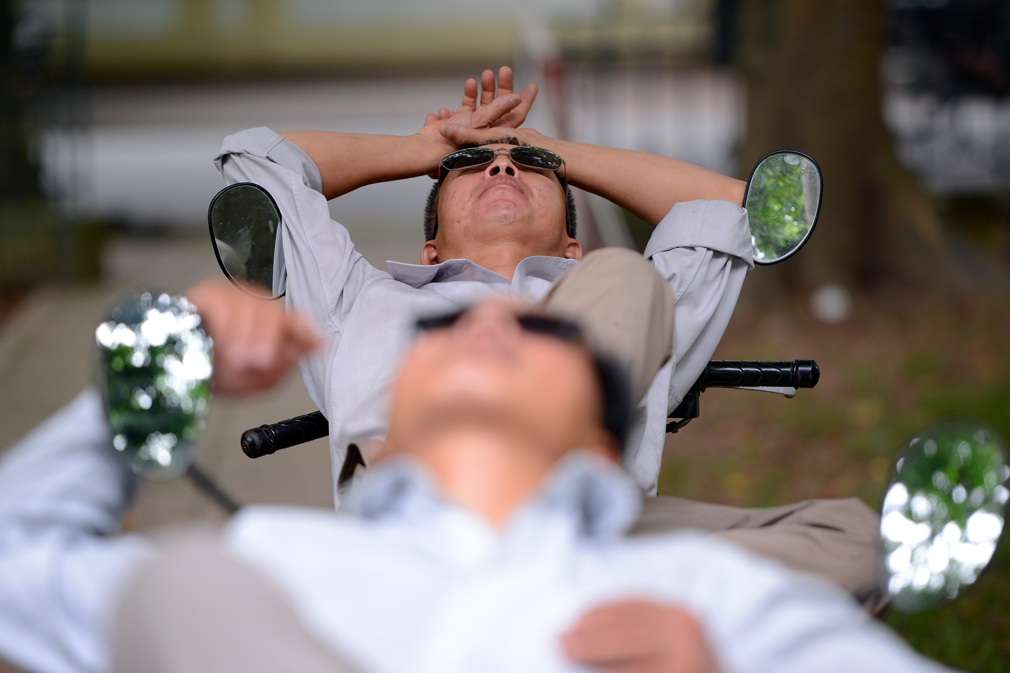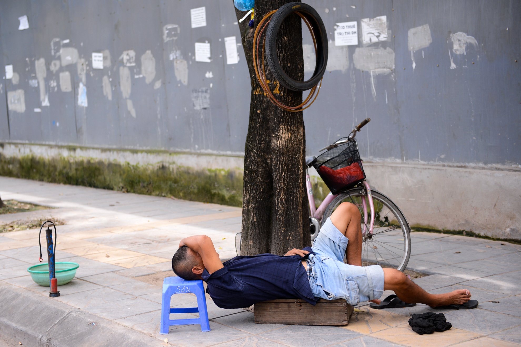| Gối đầu vào ghế nhựa dù có cứng và bị đau nhưng lâu ngày cũng quen. Người đàn ông sửa xe đạp ngả lưng ngay trên thùng dụng cụ tại hè phố Nguyễn Chí Thanh. |
