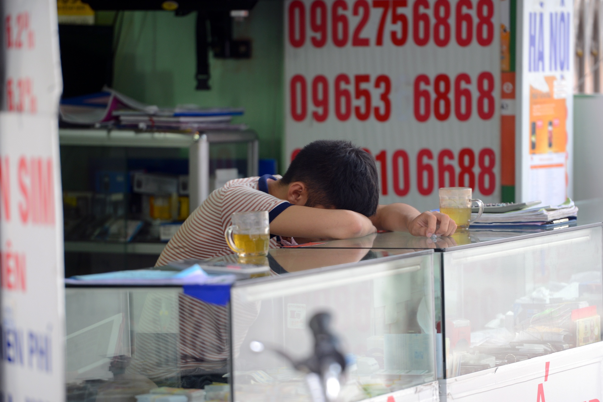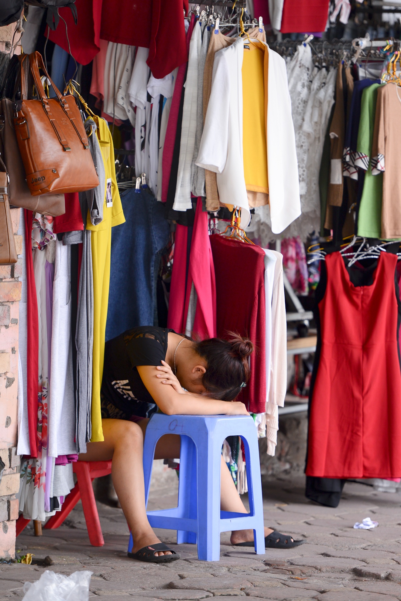 | Cách đó không xa chỉ vài chục mét là một nhân viên bán quần áo trên vỉa hè cũng gục mặt lên ghế chợp mắt khi vắng khách. |