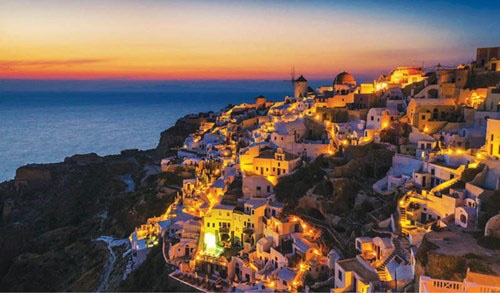 | Đảo Santorini, Hy Lạp: Đảo Santorini được coi là viên ngọc lớn nhất cùng vùng biển Aegean, đồng thời nổi tiếng với những ngôi nhà nhỏ xinh khắc sâu vào bờ đá. Màu sơn trắng tinh khiết kết hợp với sắc xanh như nước biển Địa Trung Hải hiện diện ở mái vòm hay cửa sổ tạo nên một tổng thể sắc màu hài hòa cùng thiên nhiên. Khi chiều đến, từng đoàn khách du lịch từ khắp các ngõ ngách trên đảo đổ về đây để say sưa thưởng thức những giây phút cuối ngày tuyệt đẹp. Những ngôi nhà trắng như tuyết chuyển dần sang vàng nhạt, rồi nhuốm màu hồng cam và ngả hẳn sang tím trước khi thị trấn được chiếu sáng bởi những ánh điện đêm lung linh, huyền ảo. |
