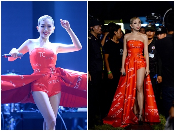 | Phong cách mạnh mẽ, cá tính của Tóc Tiên được củng cố với bộ cánh jumpsuits, kết hợp váy xẻ cao. Thiết kế có họa tiết chữ viết tên người đẹp giúp cô tự tin trên sân khấu. Ảnh: Bil |