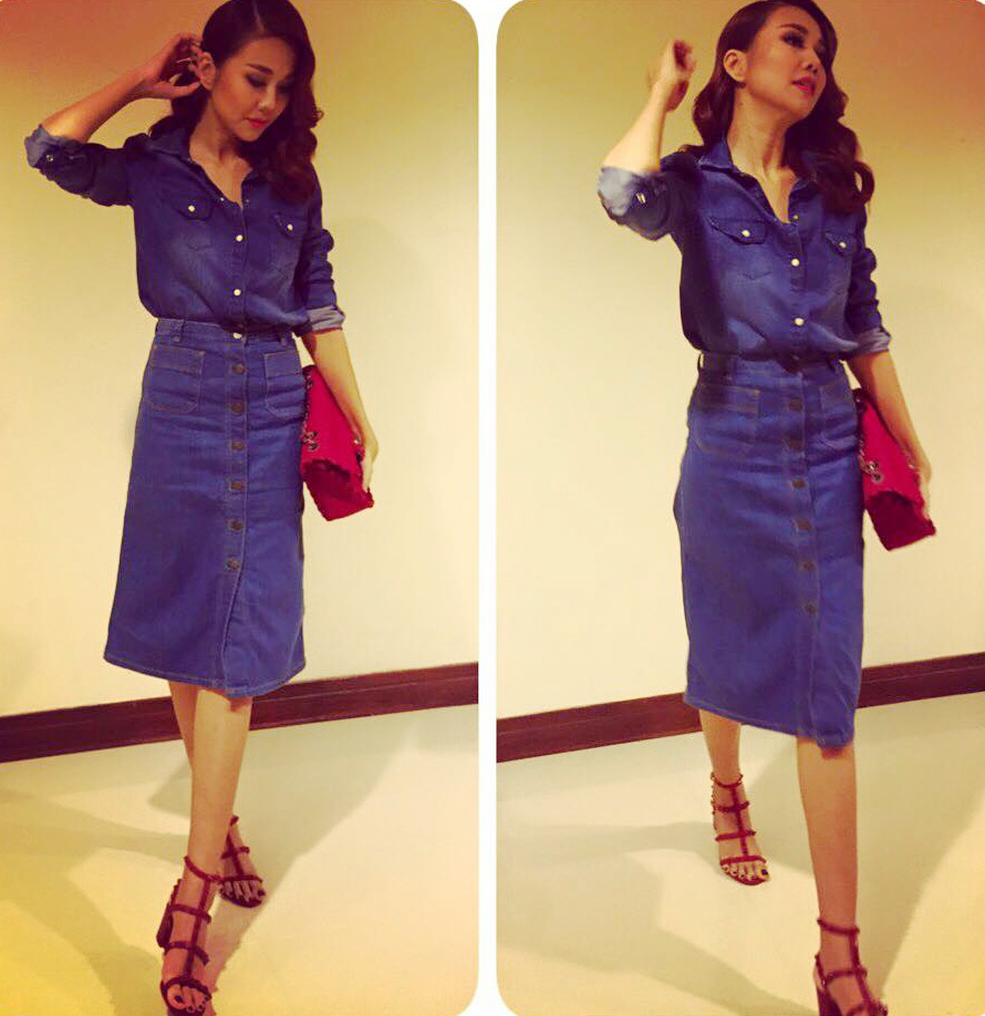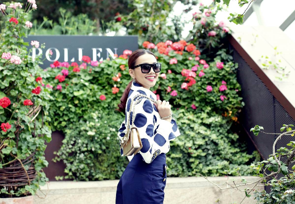 Thời trang thường ngày của cô rất đơn giản với mái tóc búi cao trẻ trung.