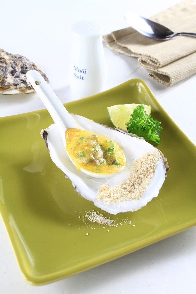 Hàu phô mai đút lò có hương thảo, lá gia vị trong món Âu, thơm và đậm đà. Ảnh: Hoàng Thụy. |