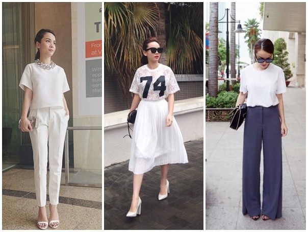 Hình ảnh nữ tính, nhã nhặn của Trà Ngọc Hằng trên phố gắn liền với loạt trang phục kín đáo, hiện đại. Tông màu sáng tôn làn da trắng và vóc dáng yêu kiều.
