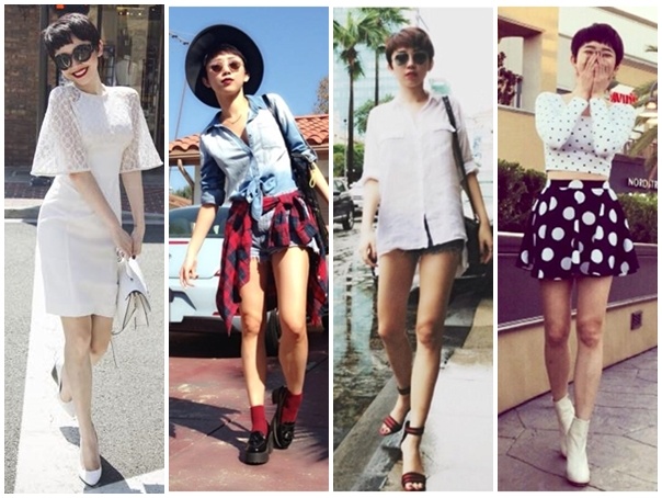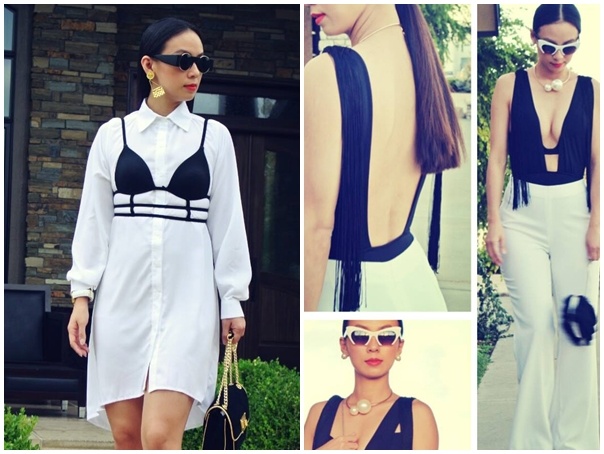 MC Huyền Ny: Không hoạt động showbiz mạnh trong thời gian qua, song Huyền Ny lại khá đầu tư về hình ảnh thời trang. Tại Mỹ, cô mạnh dạn khoe những bộ cánh street style đậm cá tính và gợi cảm. Một trong những xu hướng được người đẹp đón đầu là mốt áo bra mặc ngoài áo sơ-mi nổi bật. Những kiểu mốt tưởng chừng dành cho thảm đỏ như áo cổ chữ V sâu cũng được người đẹp vận dụng thành công khi xuống phố.
