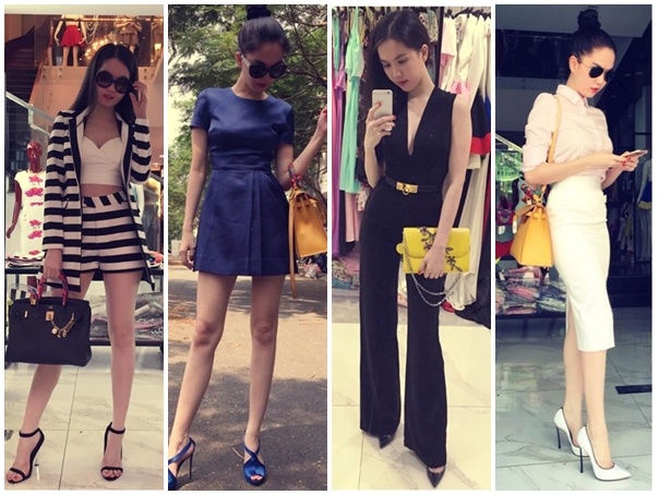 | Ngoài gợi cảm, nữ người mẫu nội y còn rất chuộng trang phục thanh lịch, nữ tính. Giày cao gót là một trong những phụ kiện mà Ngọc Trinh không thể rời xa. Dù xuất hiện trước công chúng hay dạo phố, người đẹp đều gắn liền với đôi giày tôn vóc dáng kiêu sa, kiều diễm. Túi xách hàng hiệu cũng là một trong những món thời trang được cô rất mực "cưng chiều". |