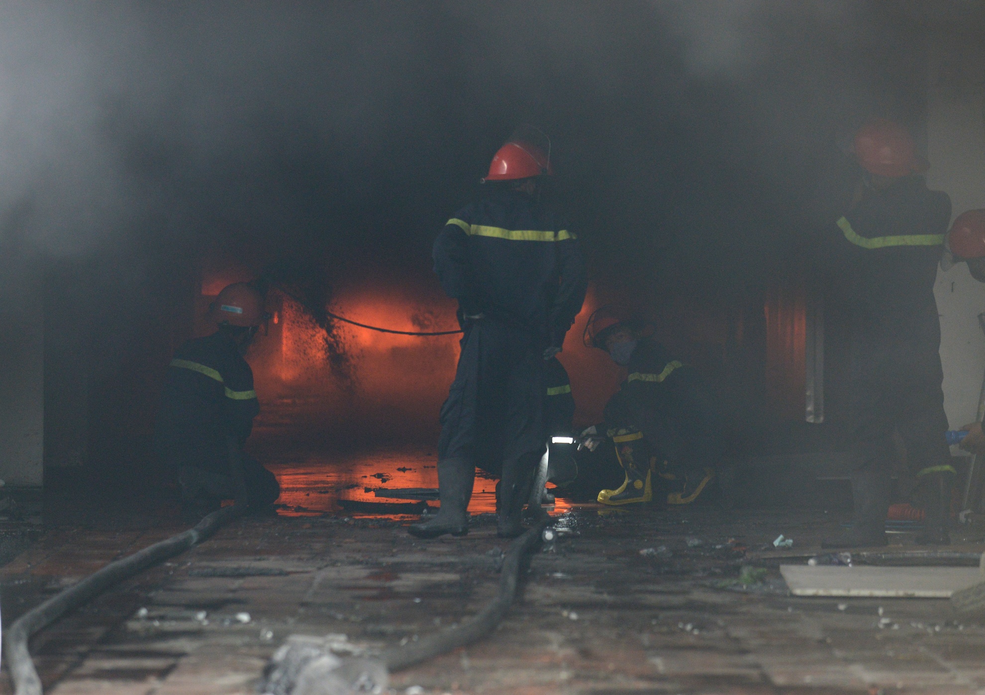 Phía bên ngoài, công nhân đơn vị đang di chuyển các thiết bị chữa bị cháy ra khỏi hiện trường.