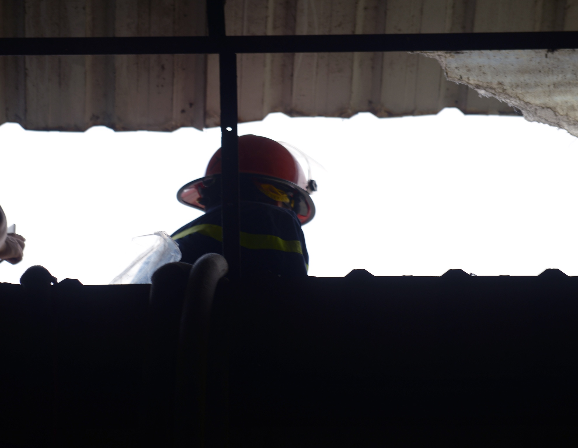 Cảnh sát PCCC dỡ mái tôn của Công ty Đại Hoàng Nam nằm bên cạnh hiện trường để tiếp cận đám cháy.