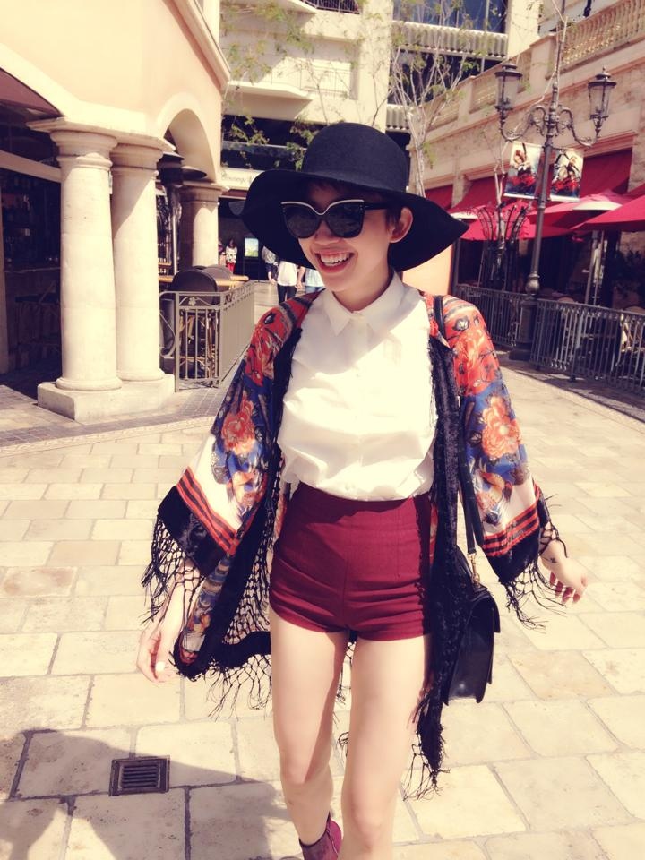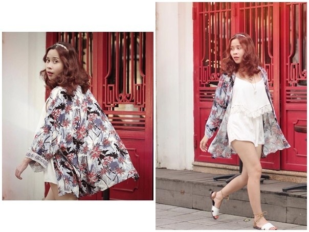 Bà mẹ một con Lưu Hương Giang cũng không kém cạnh các đàn em về độ sành điệu khi diện áo kimono họa tiết hoa mùa hè.