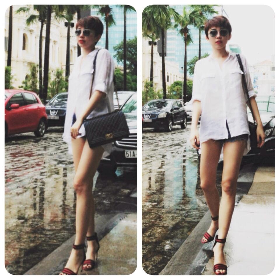 Mốt áo sơ-mi dáng dài ăn nhập với ngoại hình Tóc Tiên, giúp cô khoe lợi thế chân dài.