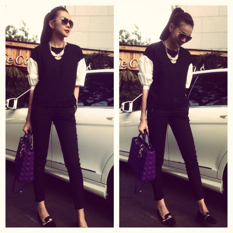 Diện trang phục trắng đen, cô tự tin khi xuống phố.