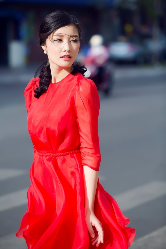 Tóc mái lệch ngôi: Gương mặt trái xoan thon gọn giúp Triệu Thị Hà dễ dàng chọn lựa kiểu tóc ăn ý cùng trang phục. Trong bộ ảnh thời trang hè với các thiết kế của Lê Thanh Hòa, người đẹp đón đầu xu hướng tóc mái lệch. Cô là một trong số ít sao nữ trung thành với màu tóc đen.