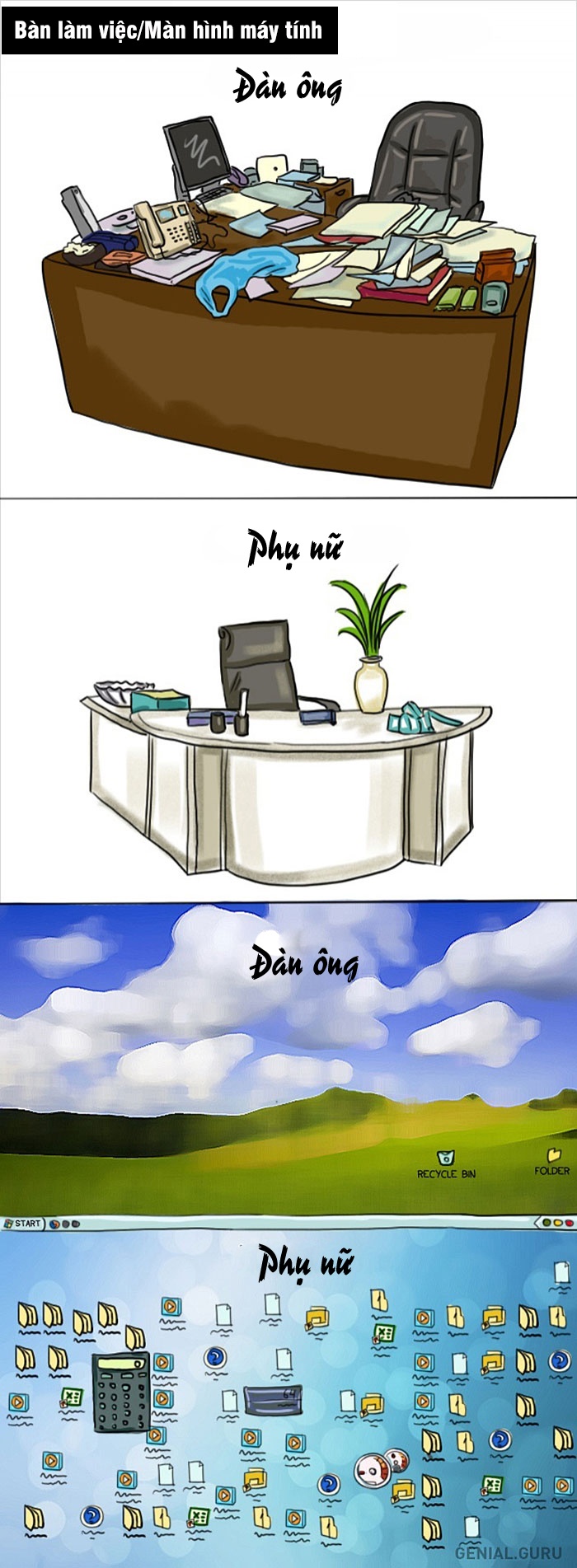 | Bàn làm việc và màn hình máy tính của nam và nữ thường có sự đối lập. |